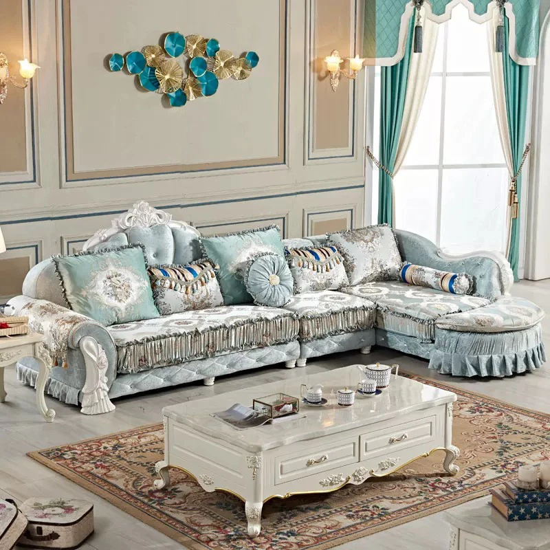 豪華な欧風布張りL字型ソファセット - エレガントな彫刻木製フレーム、大小様々なリビングルームにぴったりのシンデレラデザイン!快適さとスタイルを両立させた、貴族のような贅沢空間を実現。