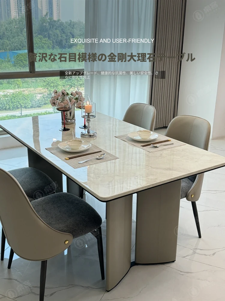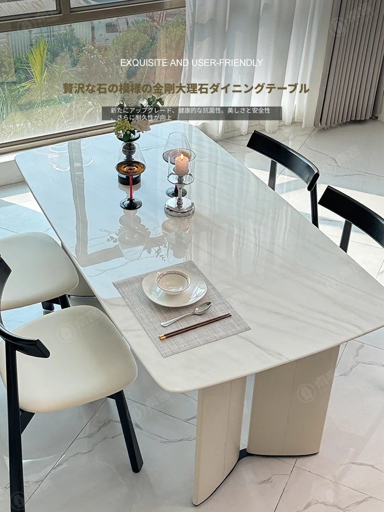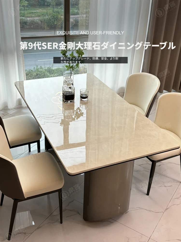 クリーム風大理石ダイニングテーブル&チェアセット|フレンチシックなラグジュアリー感|天然ミクロ結晶石使用|モダンでシンプルな長方形デザイン|上質な食卓を演出します!