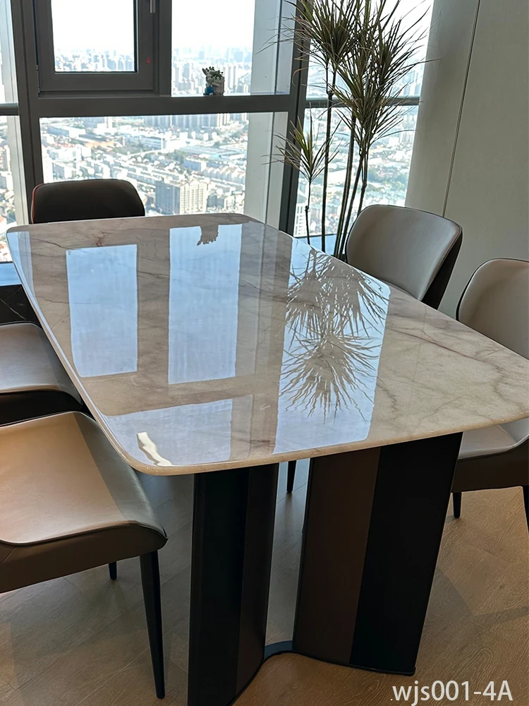軽やかな高級感のあるモダンミニマリストデザインの微晶石ダイニングテーブル&チェアセット。天然超晶石大理石を使用した長方形の奢華な家用家具で、洗練された食事空間を演出します。