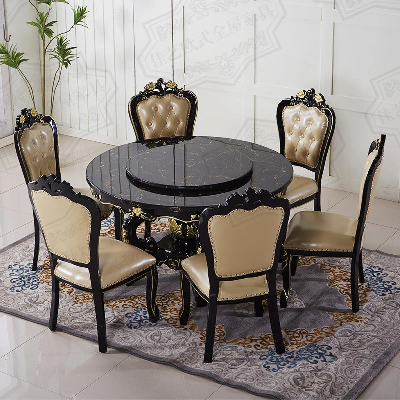贅沢なヨーロピアンスタイルの純粋な無垢材大理石ダイニングテーブルセット、アメリカン彫刻デザイン、6人用の家庭用食卓で、上品な食事空間を演出します。