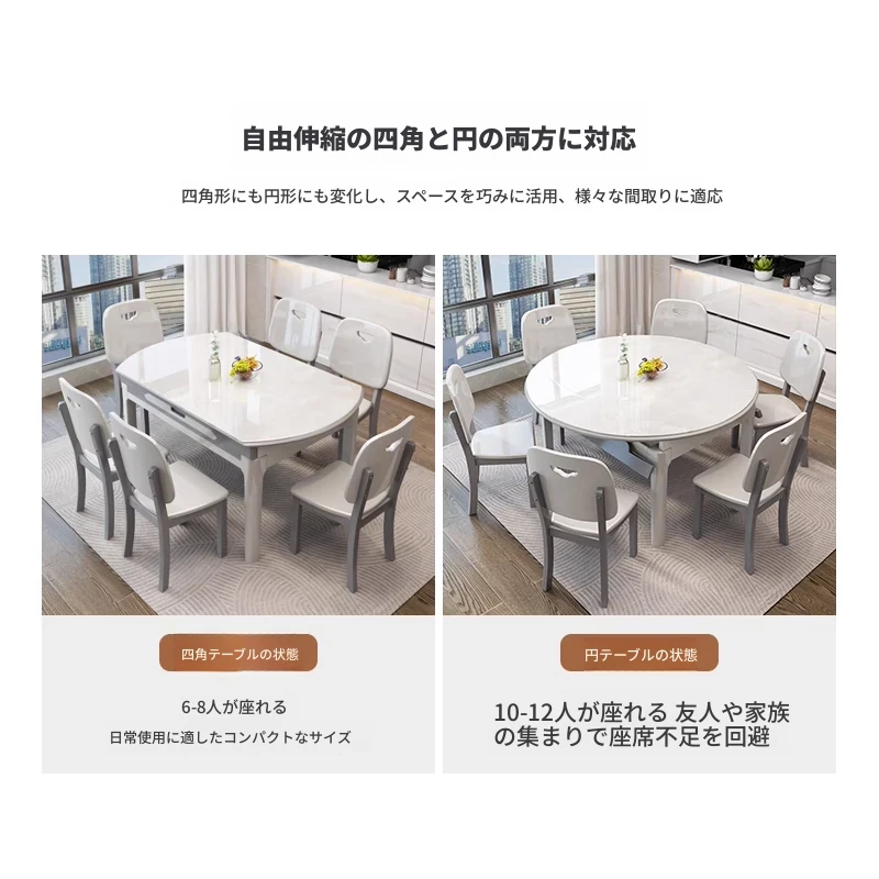 【香港送料無料】天然大理石使用!伸縮可能なモダンデザインの実木ダイニングテーブル - シンプルでスタイリッシュ、四角形と円形の2WAY!高級感溢れる一品で、あなたの食卓を華やかに演出します。