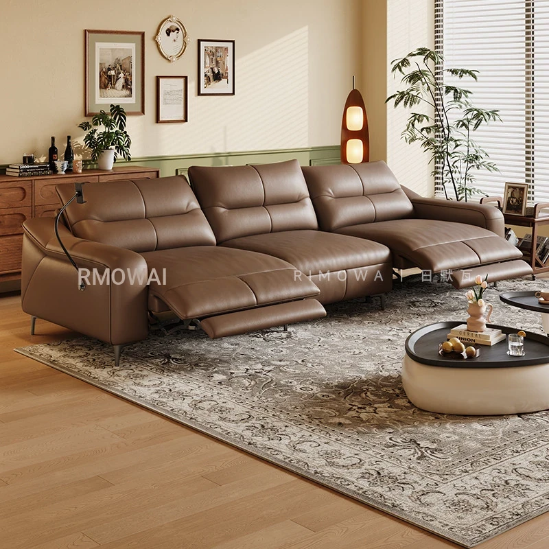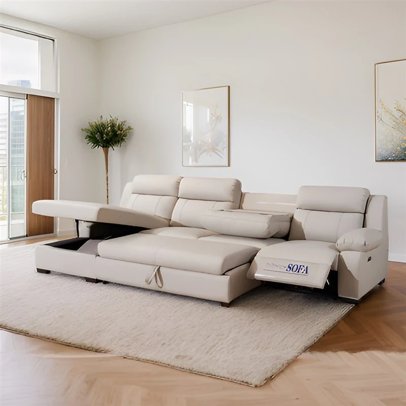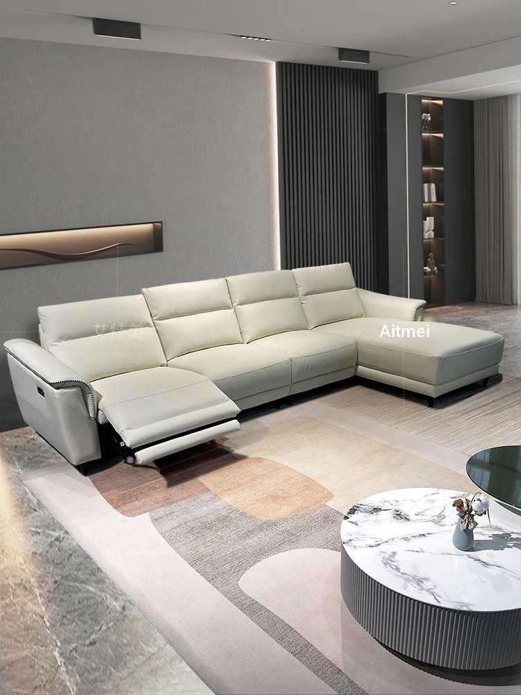 Modern Minimalist Genuine Leather Electric Sofa - Cream-Colored Corner Recliner with Versatile Features for Stylish Living Rooms