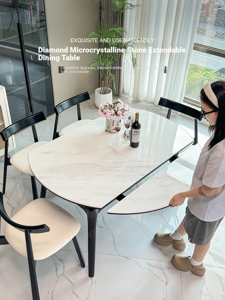 Natural Microcrystalline Stone Expandable Round Dining Table with Premium Solid Wood Legs – Perfect for Small Spaces, High-End Marble Finish for a Touch of Luxury in Your Home