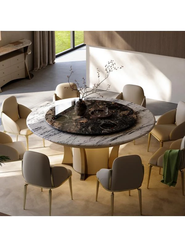 Luxury Natural Marble Electric Round Dining Table with Rotating Turntable and Induction Cooker - Perfect for Upscale Villas and Homes