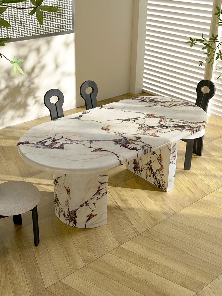 Elegant French Oval Karakata Purple Marble Dining Table - Modern Minimalist Design for Small Spaces, Luxurious Vintage Charm