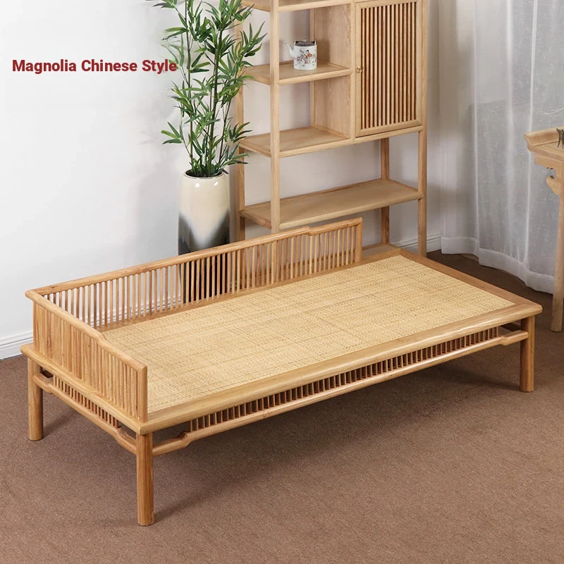New Chinese Style Rohan Bed - Elegant Rattan Surface, Zen-Inspired, Vintage Elm Wood, Minimalist Rohan Sofa for Study Room - Antique Solid Wood Chaise Lounge Chair