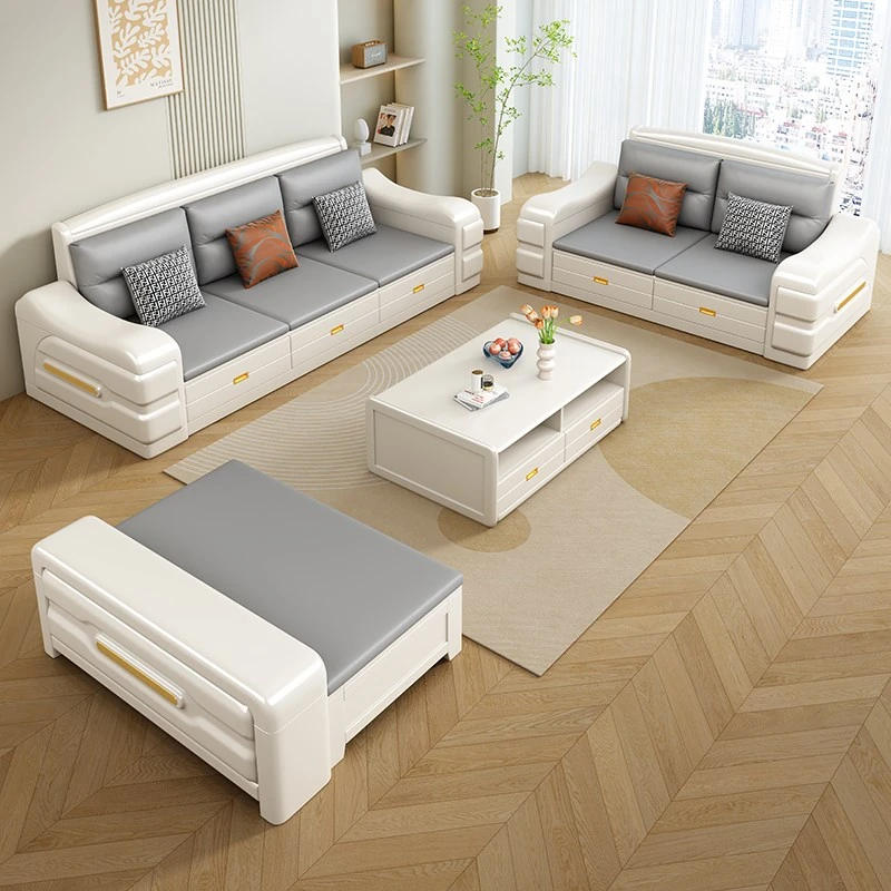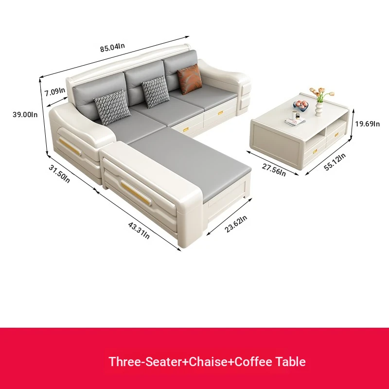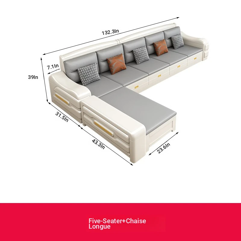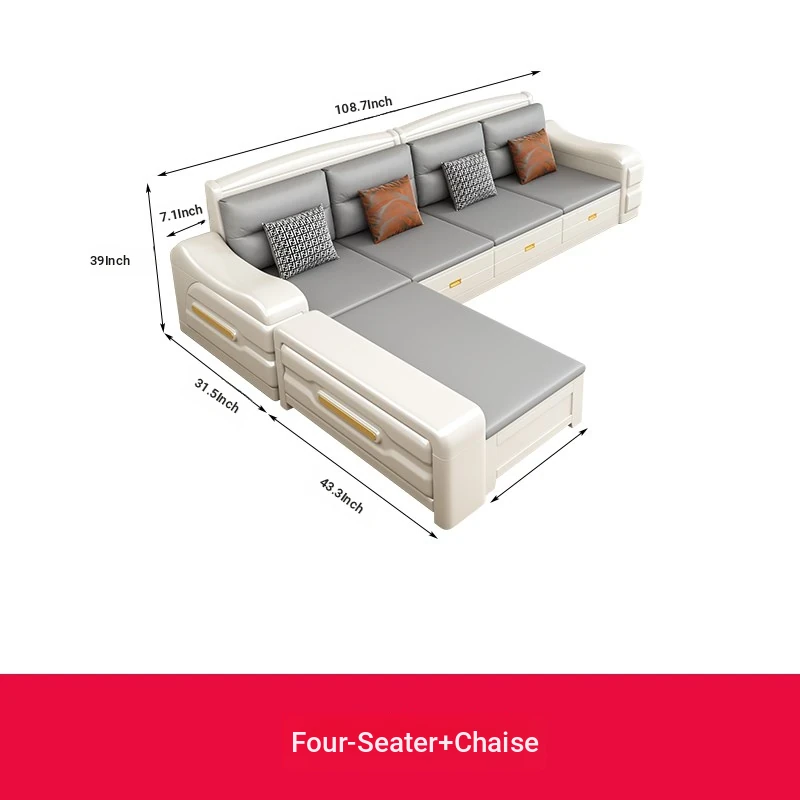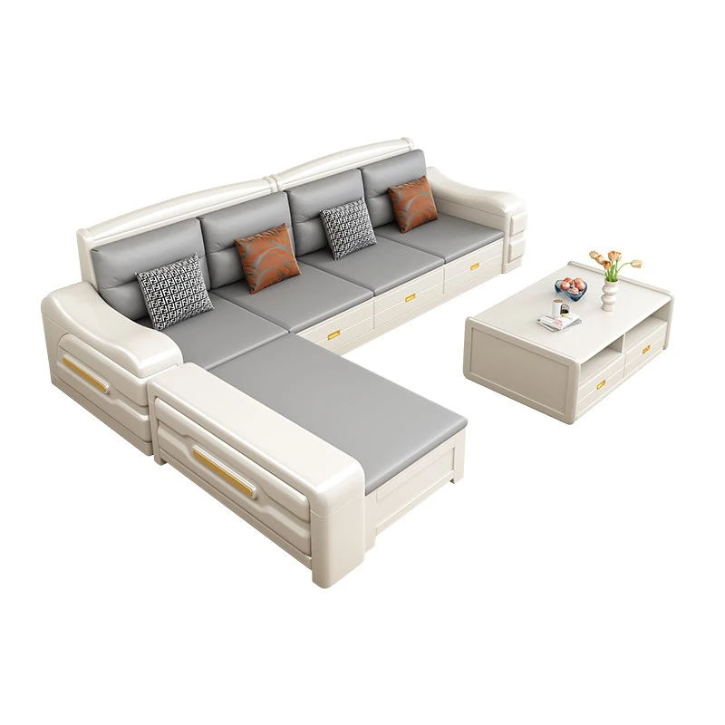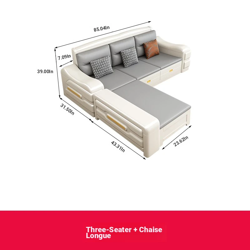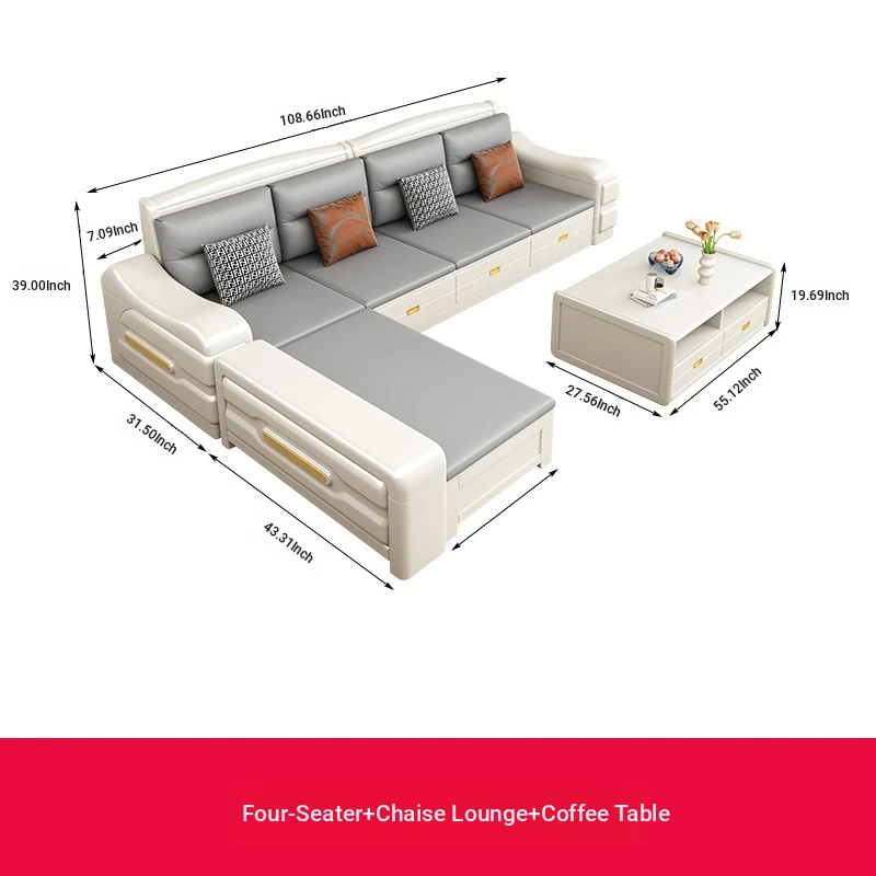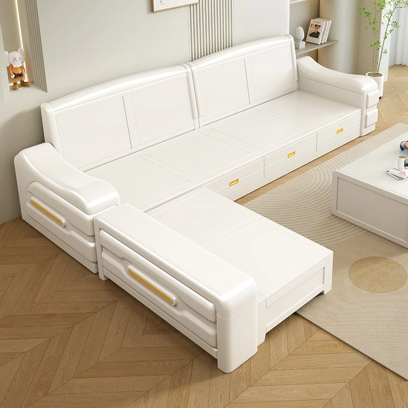 Modern Minimalist Solid Wood Sofa with Fabric Upholstery - White Living Room Corner Chaise Lounge with Drawers for Storage, Perfect for Winter and Summer Use