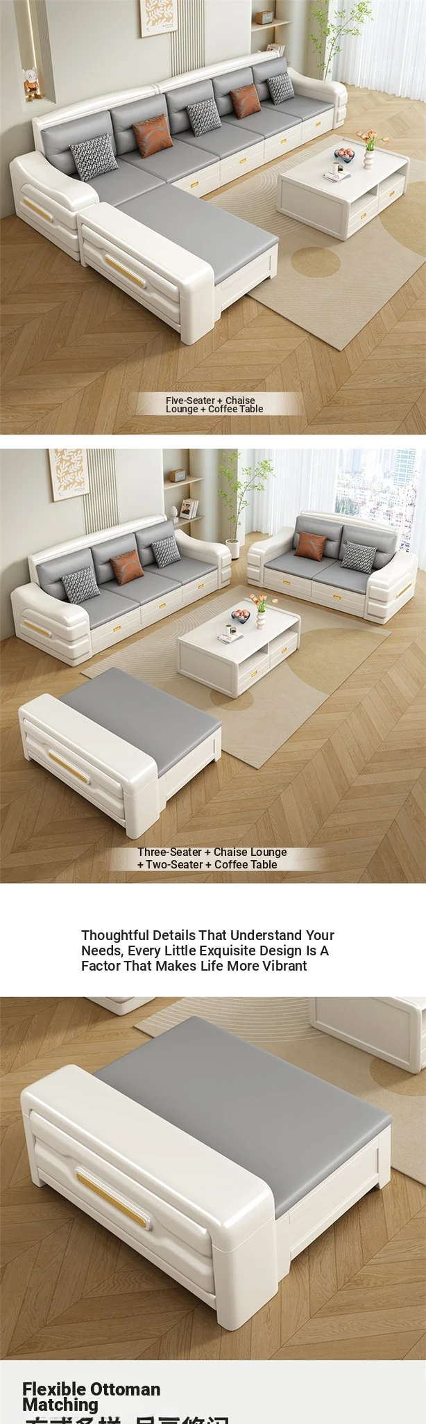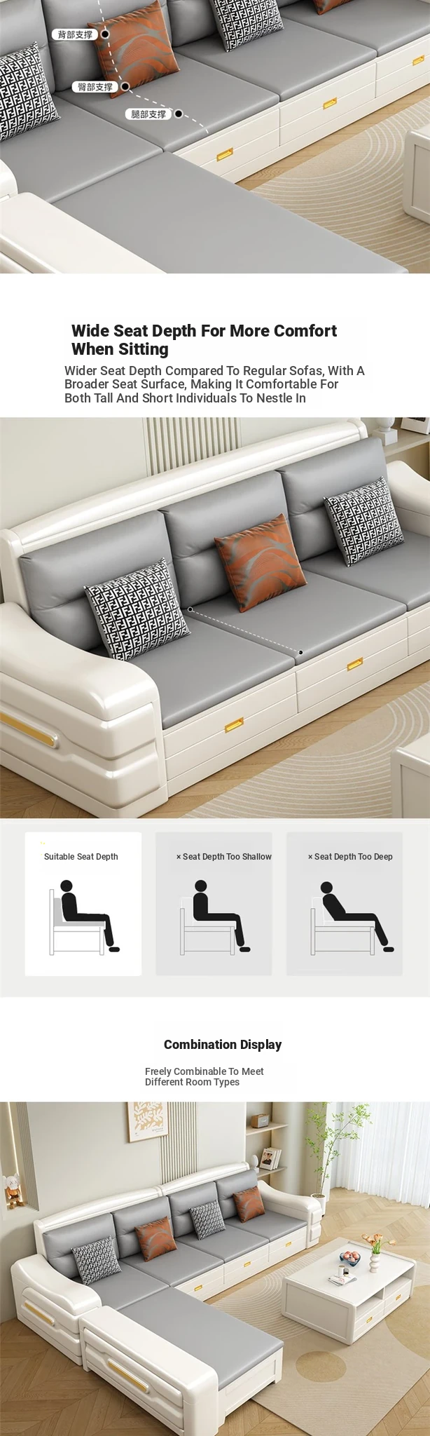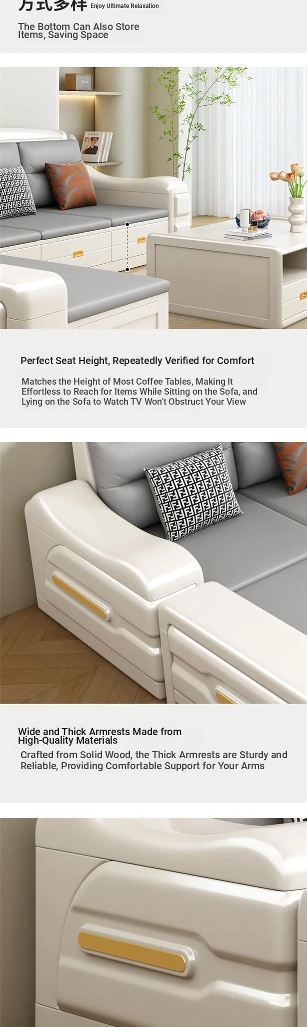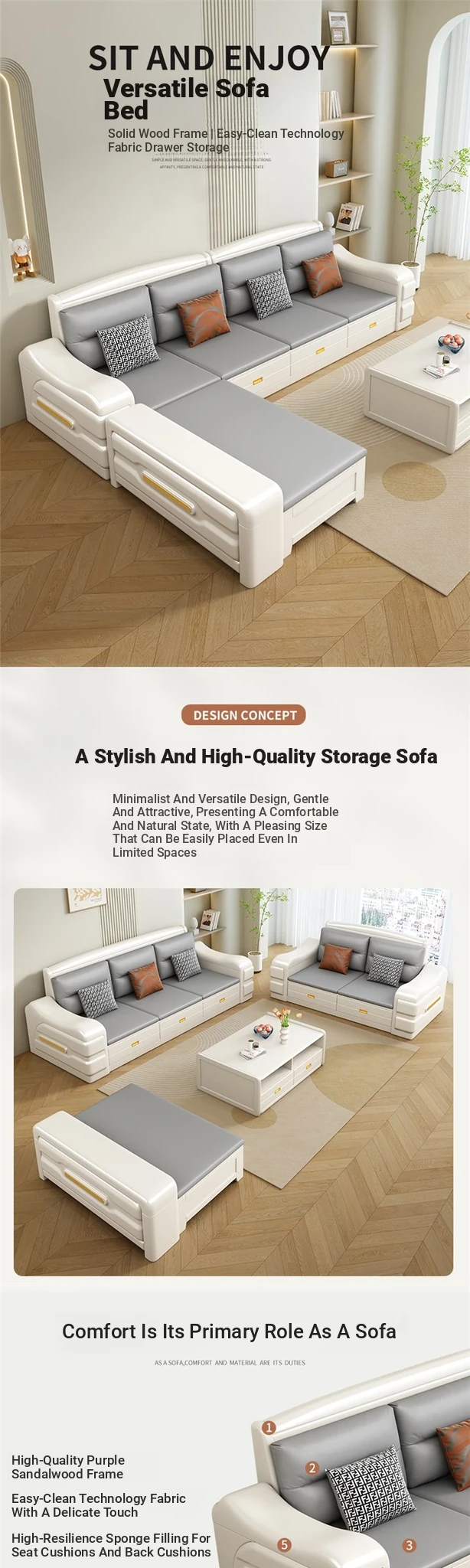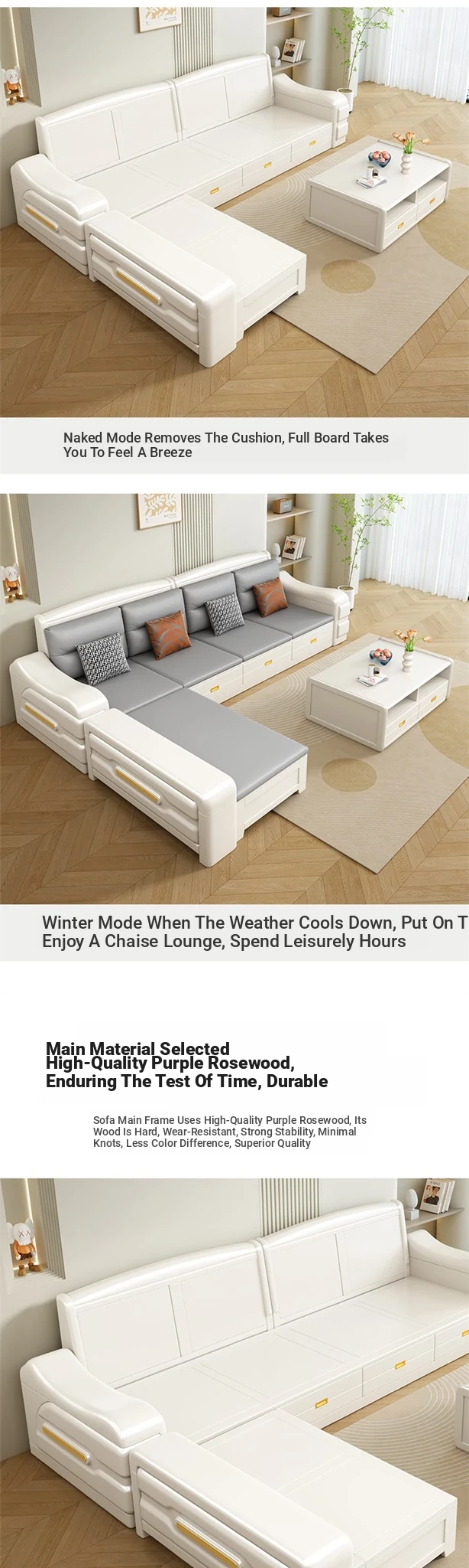 Modern Minimalist Solid Wood Sofa with Fabric Upholstery - White Living Room Corner Chaise Lounge with Drawers for Storage, Perfect for Winter and Summer Use