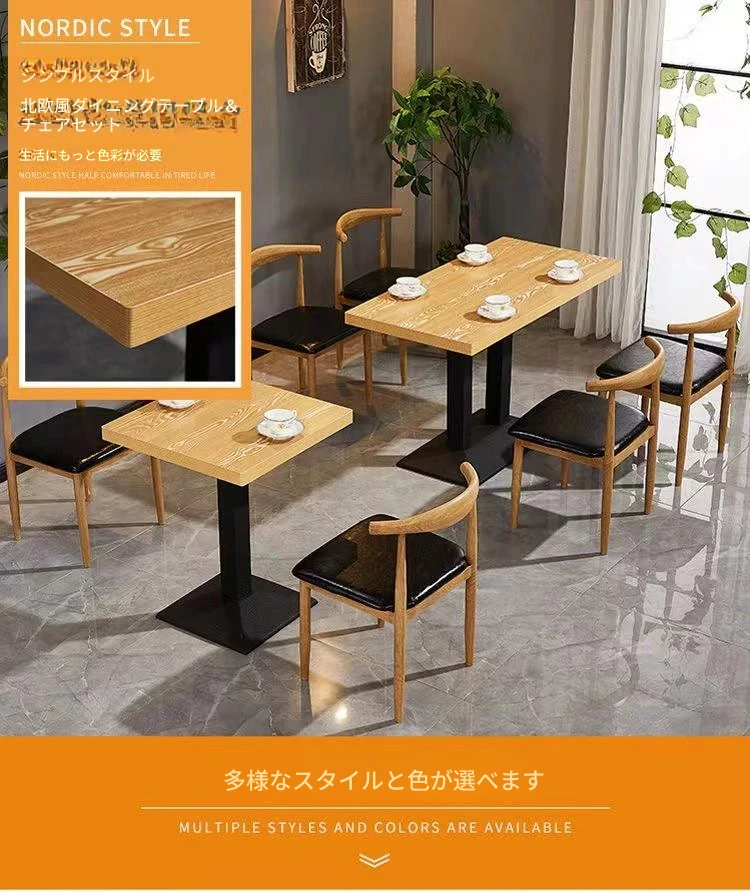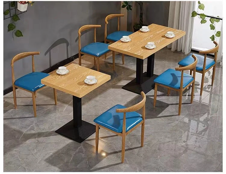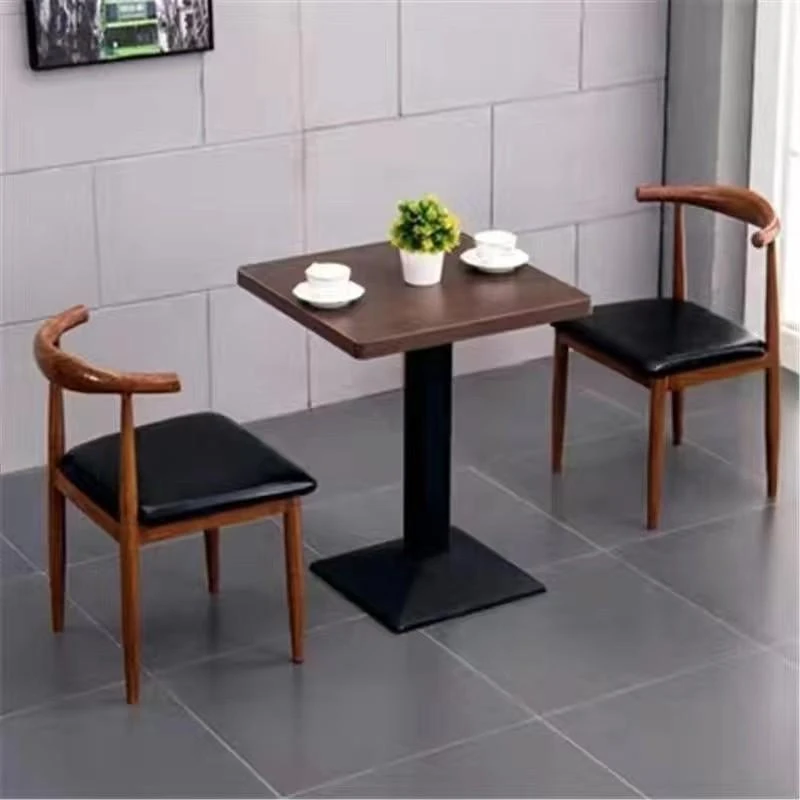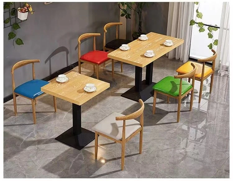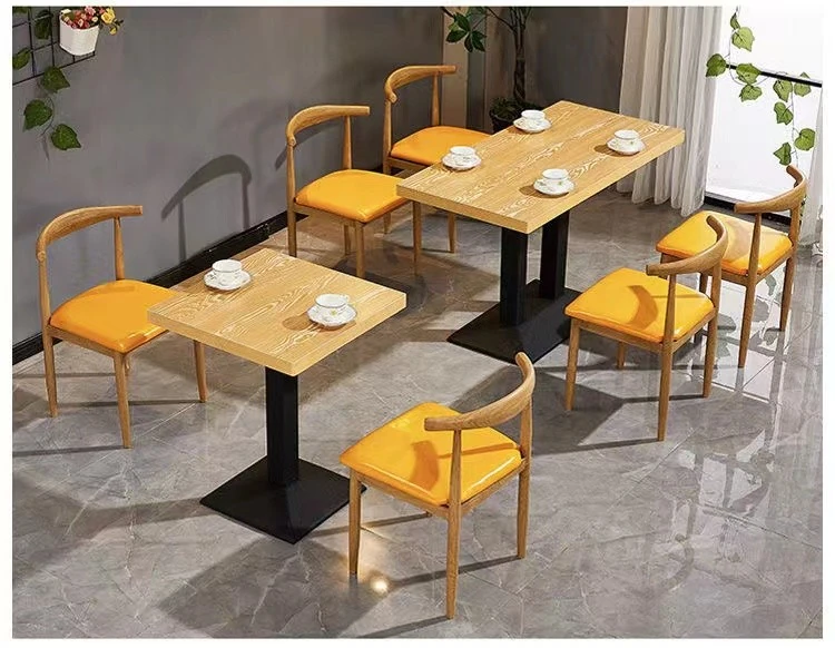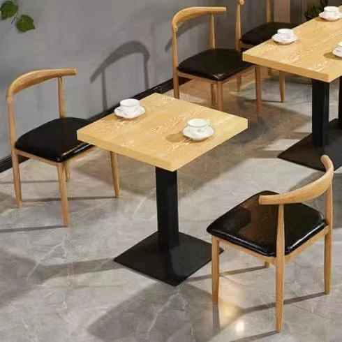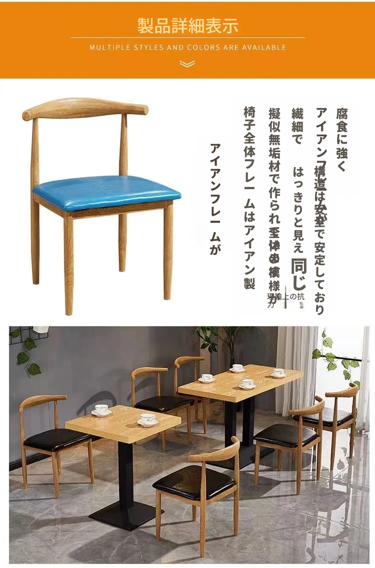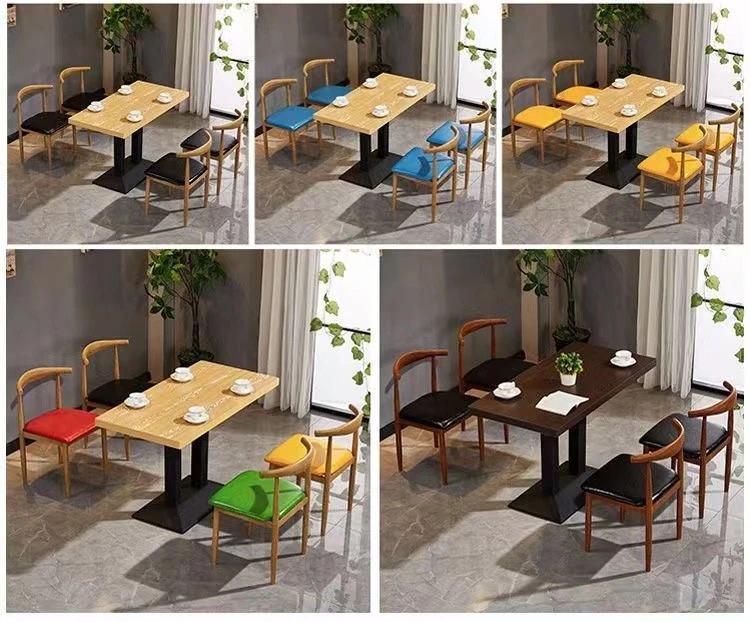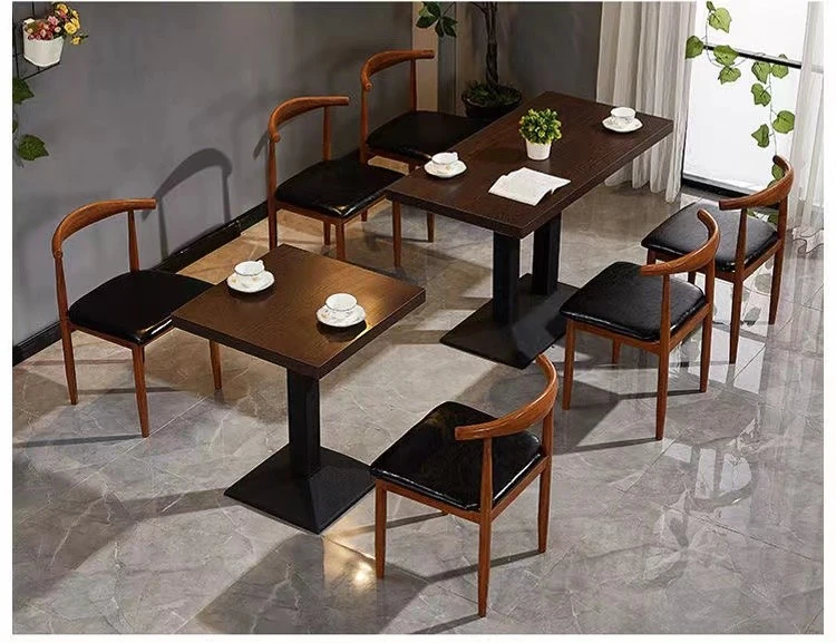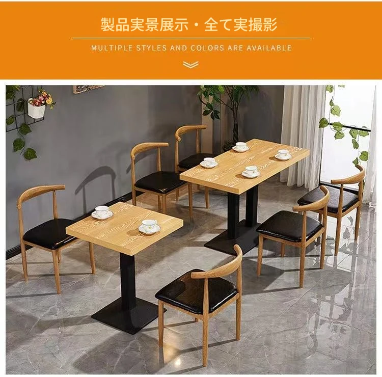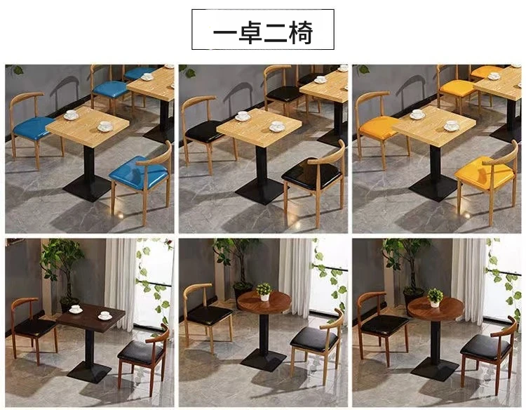 鉄製シンプルデザインのカフェテーブル&チェアセット|本物の木の質感を再現した牛角椅子|スタイリッシュなファーストフード店、スイーツショップ、ハンバーガー店に最適!食堂やレストランにもぴったり。