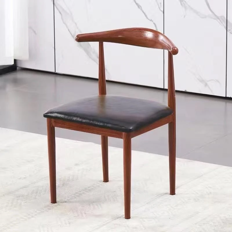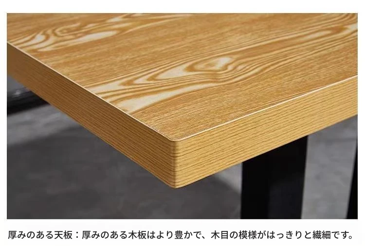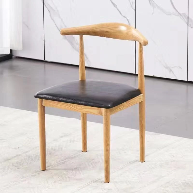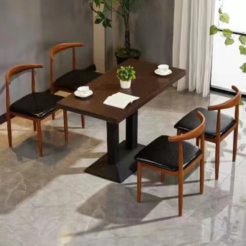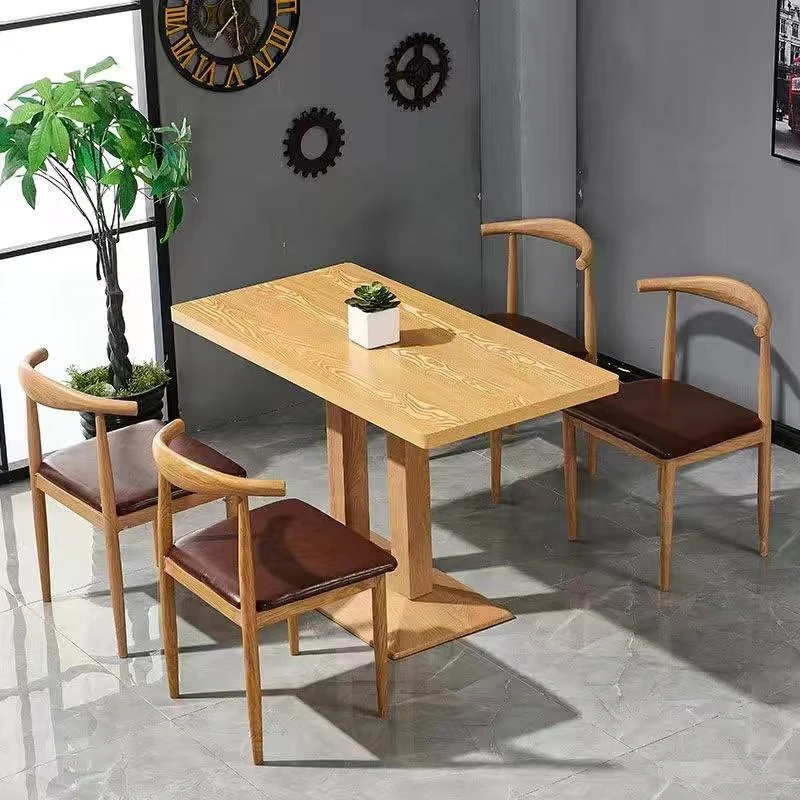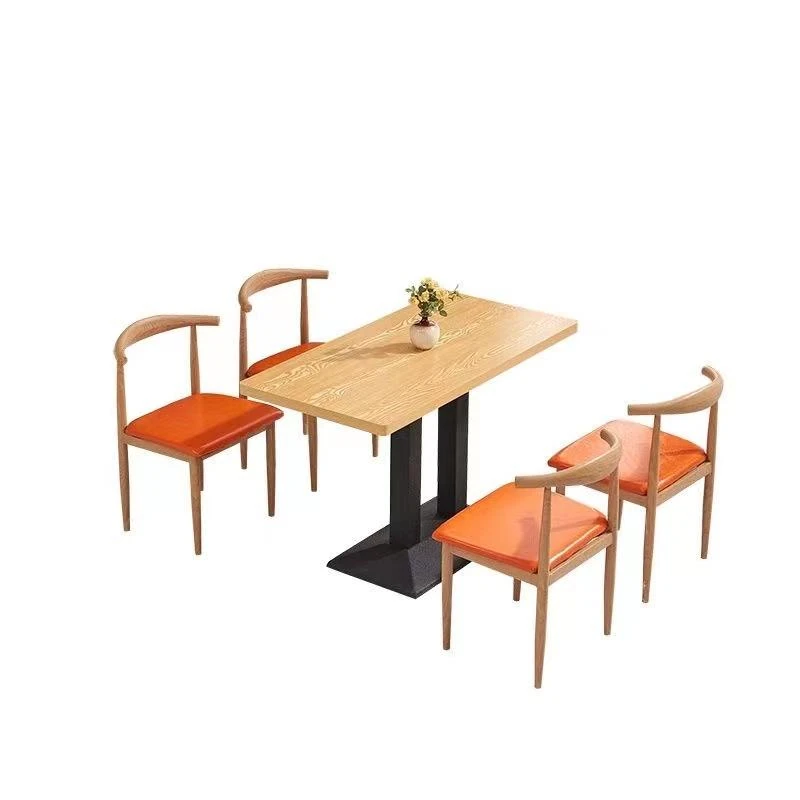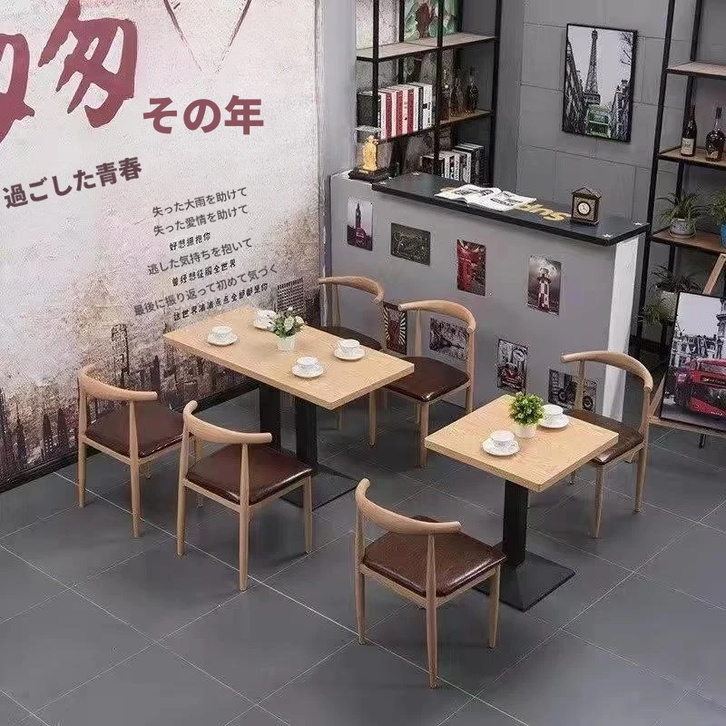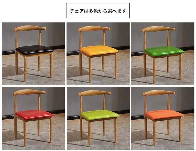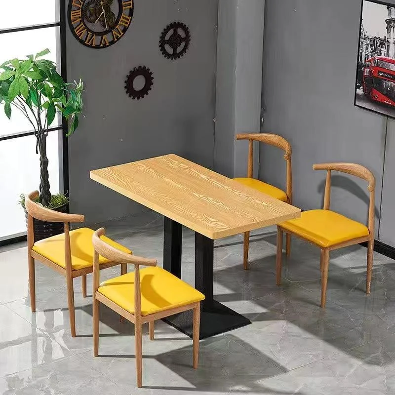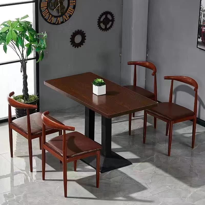 鉄製シンプルデザインのカフェテーブル&チェアセット|本物の木の質感を再現した牛角椅子|スタイリッシュなファーストフード店、スイーツショップ、ハンバーガー店に最適!食堂やレストランにもぴったり。