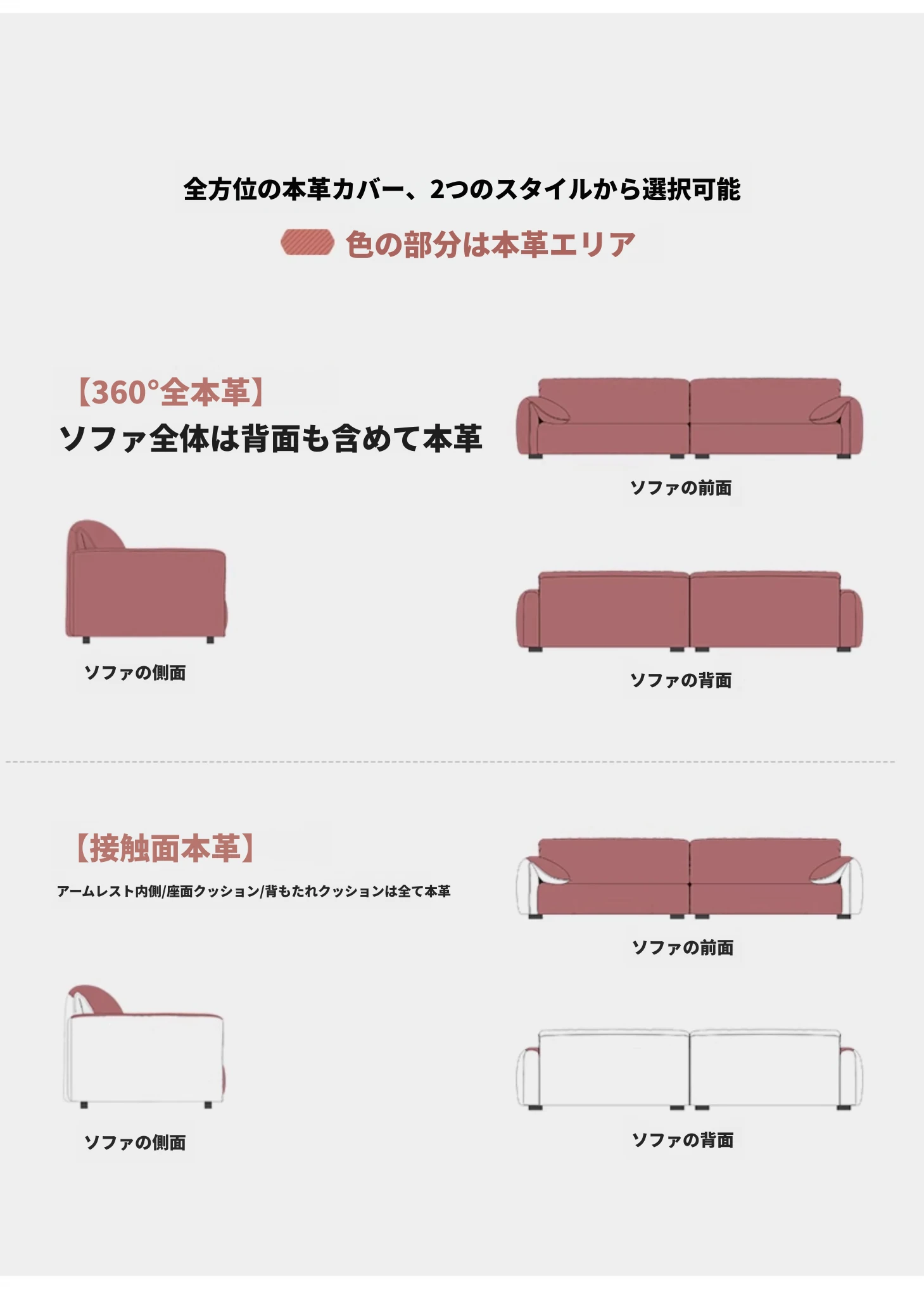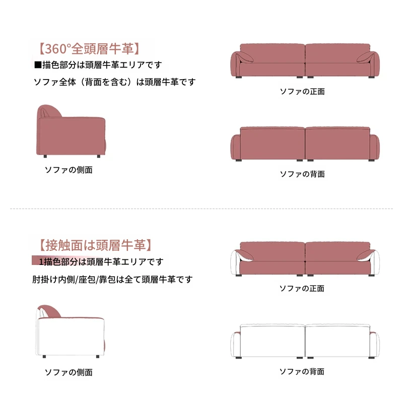 【接触面がトップレザーで覆われている】と【360°全体がトップレザーで覆われている】の違い