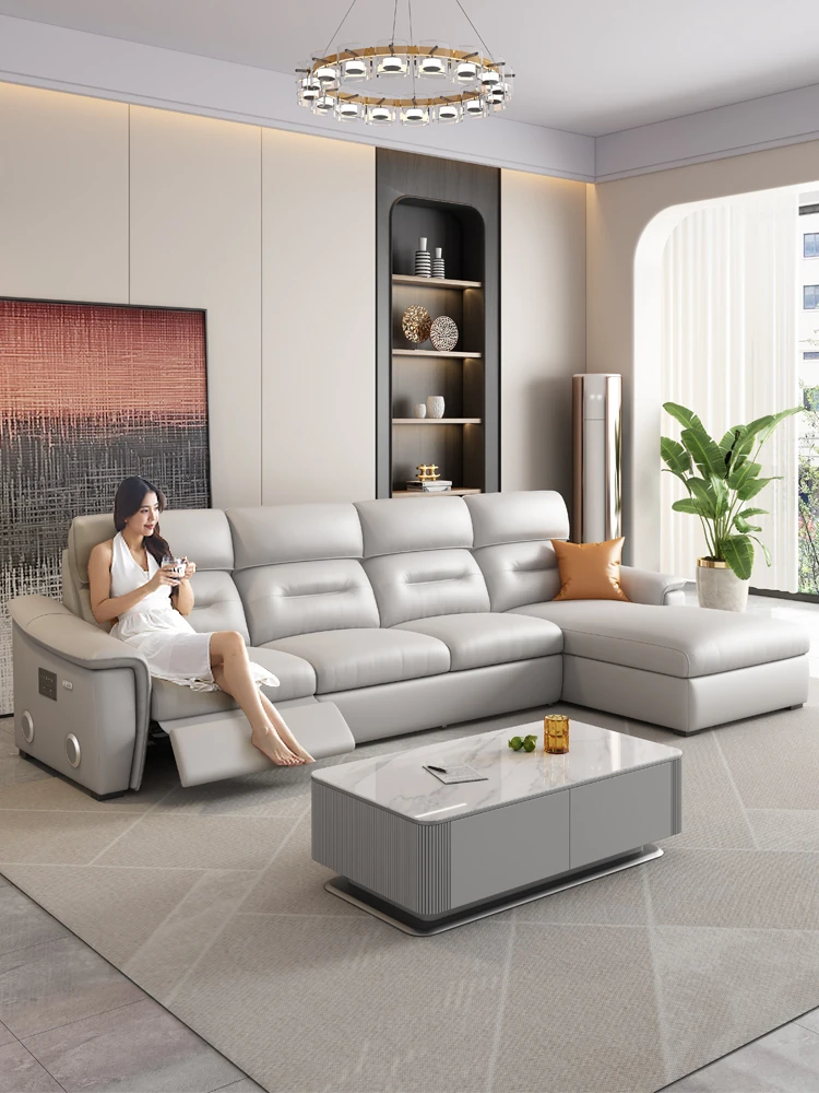 壁に寄りかからないクリーミー風の本革マルチファンクションソファ!電動リクライニング可能な3人掛け、最高級の牛革使用のイタリアンスタイルリビングソファで、快適なくつろぎ空間を実現します。