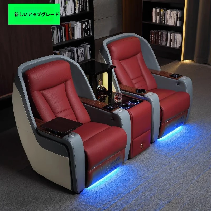 高級感溢れるファーストクラスシアターソファー!電動本革仕様で、プライベートなヴィラのシアタールームに最適な一人用リクライニングチェア。極上のリラックス体験をお楽しみください!